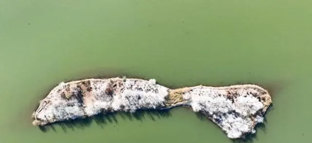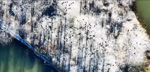 由於鳥類數量較多,鳥糞把樹木染成了白色,從高處看,這座湖心島白茫茫一片,仿佛覆蓋了一層積雪。