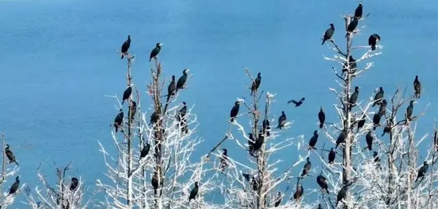 顏軍告訴記者,普通鸕鶿通常棲息在水邊的高處,如湖邊的電線塔和樹梢。