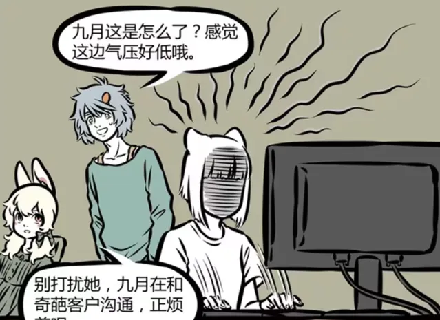 九月大多時候都在摸魚,不過偶爾也會努力工作。哮天發現九月情況不太對,感覺身邊氣壓很低。那麽九月到底是怎麽回事?小玉告訴哮天,現在最好不要打擾他,九月跟奇葩的客戶溝通,搞得十分煩躁。