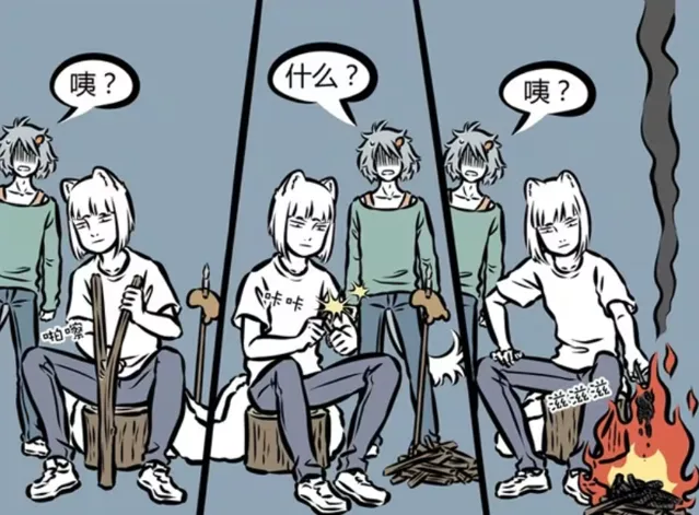 接下來九月的操作,讓哮天更加疑惑。九月不知道哪裏找來木樁、柴火和小刀。那是坐著劈柴、用打火石點火。柴火點著之後,九月還將解壓小熊放在上面烤。哮天看到這一系列操作,那是不知道該說什麽?