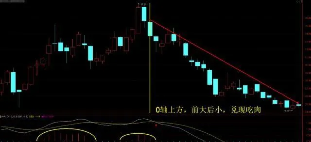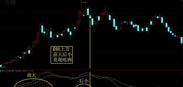 第二、如果行情在零軸上方也出現了前大後小的情況,就是離場兌現的時候了,這個時候不要舍不得,說走就走,不要跟他磨跡。