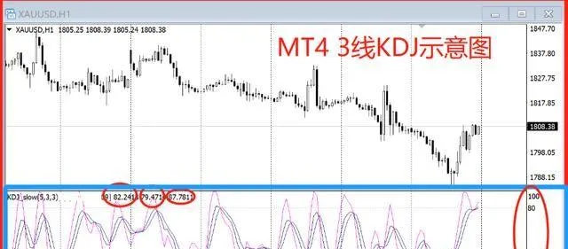 第二張圖是MT4上,KDJ指標的示意圖。