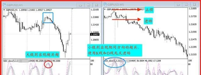 當小級別也出現了相同方向的超買或超賣,使用小級別的K線和D線交叉進場,止損設定在小級別的高點或低點,盈虧比設定3:1以上。