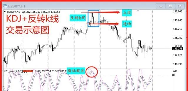 在圖表上,當KDJ指標進入到超買超賣區之後,關註k線圖表上,形成反轉的k線形態之後進場,止損可以設定在反轉形態的上方,盈虧比設定3:1以上。