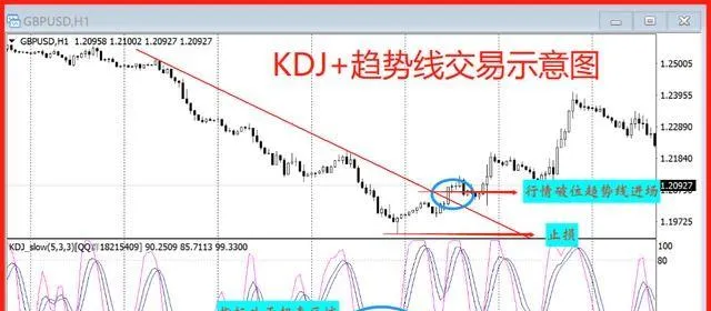 當k線圖表上出現了KDJ指標超買超賣之後,行情有反轉的預期,此時觀察k線圖表上,如果出現了趨勢線破位,或者是反轉k線組合形態破位進場,止損設定在k線的前高或者前低,盈虧比設定2:1。
