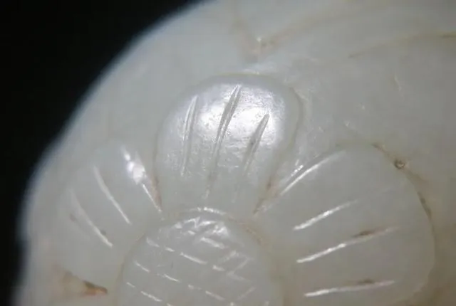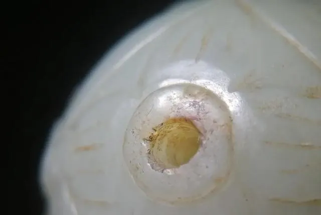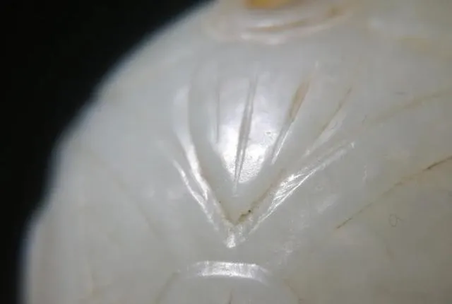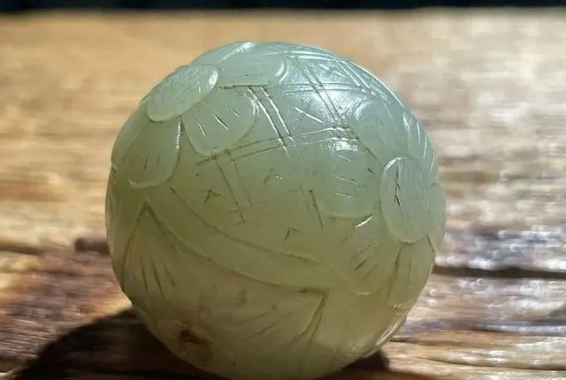 珠子在被我洗掉油泥後,稍經把玩,即有過手出油感,熟潤非常,精光內蘊。再細看之下,局部的陰刻線,已經磨損包漿到幾乎快平整了。有朋友看到,說這玉珠碩大的個頭,也似金元舊玉。