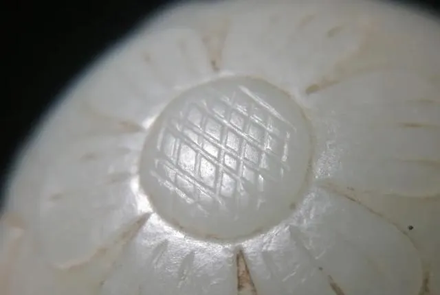 拿到手時我還擔心這個玉質太青,結果稍微一清理老油泥,色澤跟在櫃台裏看的大不一樣,屬於青白色。這大直徑的玉珠子,店家說是清代的帽頂珠或爐頂珠,甚至我還短暫懷疑它是不是朝珠上的頂珠,但上手細看,可以確定它年代要比清代早得多。玉珠上四朵六瓣花,中間以雙陰線打網格隔開,陰刻線格子裏有「十」字紋飾,孔道兩端各刻畫葉子一瓣四片,以正方形方框隔開。從每一朵花的花紋,到每個花紋上的陰刻線數量,全部都是規整的數位一致,在古拙的工藝中透著一份精細和講究。這清雅可人的造型,花與葉之間內建一份清新雅致,讓我想到宋代的審美,孔道口的一點黃褐沁,更是它年長的身份證。