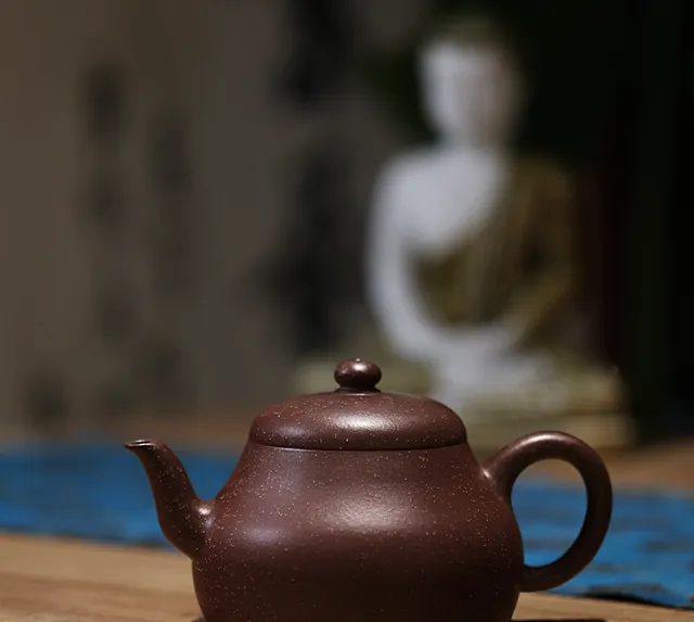 壺體敦樸沈穩,仿佛一位坐禪僧,外表安詳,內心平靜。壺面上金砂點點,如繁星閃爍,璨若星河。茶壺雖小,卻似浩瀚宇宙。