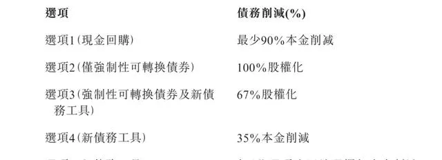 第三個選項是股權+新債券,拿出67%來股權化,剩下的也別著急找我還錢,給你換一個新的債券,意思就是展期。