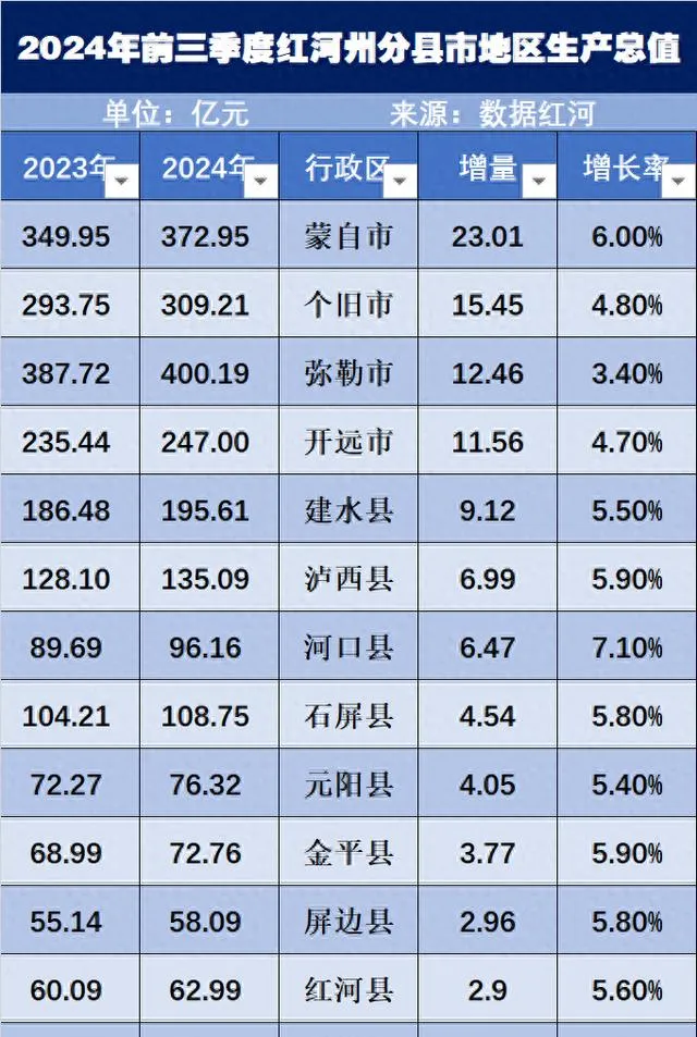 紅河州統計局和國家統計局紅河調查隊所釋出的最新數據顯示。2024 年前三季度,紅河州達成地區生產總值 2182.16 億元,同比增長 5.1%。其增速僅遜於素有「中國鋁谷」之稱的文山,在全省位列第二位。