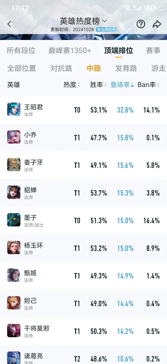 所謂一代版本一代神,每次版本更新,都會有新的英雄脫穎而出。最近,頂端排位中,王昭君的出場率已經達到了32.8%了,這個數據非常誇張,以前,也只有低分段的安琪拉有這個數據了。除了王昭君之外,頂端排位所有位置中,出場率最高的也就只有26.5%左右。而且,王昭君的勝率也高達53.1%,非常強勢。