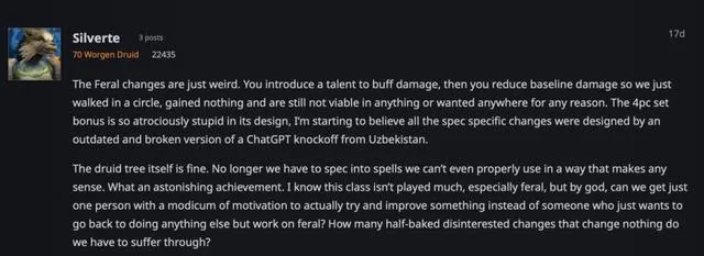 你們對野德的改動真是莫名其妙。你們引入了一個提高傷害的天賦,然後又降低了基礎傷害,讓野德就這樣原地打轉,一無所獲,並且在任何方面毫無實用性,在任何地方都不受歡迎。11.1新團本四件套的套裝獎勵在設計上愚蠢至極,我現在開始相信所有專精的改動都是由一個過時且有缺陷的山寨版ChatGPT設計出來的。