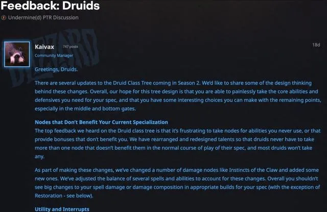 除了獵人外,暴雪在11.1中還對督伊德的職業天賦進行了不小的改動,開發團隊也在玩家社群中釋出了他們的想法。