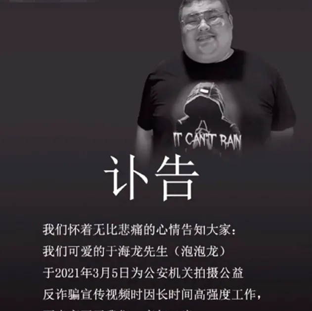 2021年3月,泡泡龍在拍攝一則反詐宣傳視訊時, 因為高強度的工作而猝死,只有29歲 。