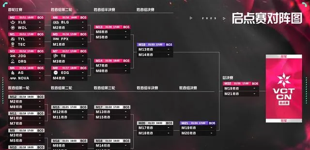 本次VCT CN聯賽啟點賽采用雙敗淘汰賽,十二支隊伍根據2024賽季的成績被分入不同組別的抽簽池中。EDG、FPX、TE、BLG四支進入2024全球冠軍賽的隊伍分入一號種子池,直接進入第二輪。包括獲得VCT CN聯賽臨時席位的XLG在內的其余八支隊伍將從第一輪開啟征程。