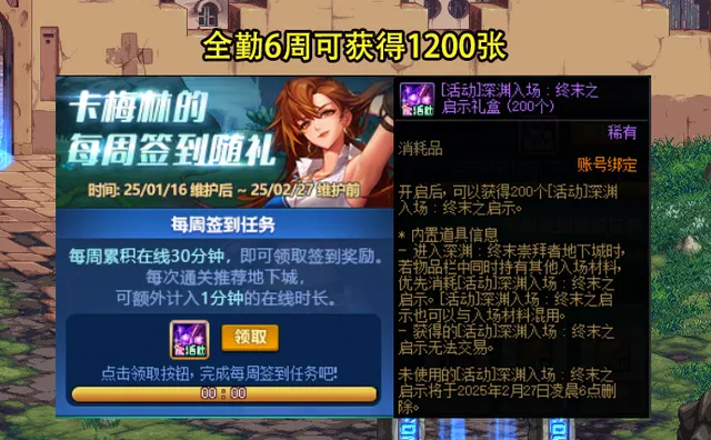 在卡梅林的每周簽到隨禮活動中, 玩家每周線上累積30分鐘,可獲得200張深淵票,活動總共持續6周的時間,也就是說全勤可獲得1200張 。