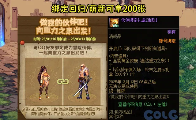 在做我的夥伴吧!向重力之泉出發活動中, 只要和一位萌新/回歸玩家進行繫結,就可以獲得200張深淵票 。