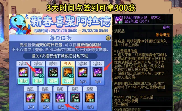 最後,在新春喜聚阿拉德活動中, 玩家只要在1.27、1.31、2.3這3個時間點刷推薦地下城簽到,均可獲得100張深淵票 ,總計可獲得300張深淵票。