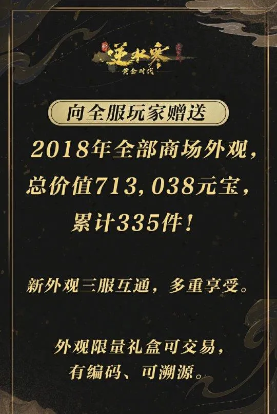 除此之外,【逆水寒】黃金服還特別照顧到了外觀黨的需求,黃金服的回饋力度之大幾乎令每一個遊玩過【逆水寒】的玩家無法抗拒。遊戲將免費贈送2018年全部商城直售外觀(共335件),總價值71萬元寶,並開放二級外觀交易市場,允許玩家查詢溯源,確保透明度。