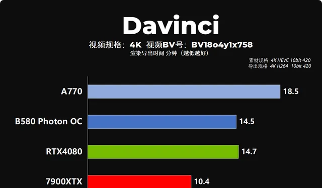 我找了一個我之前用RTX4080做的視訊工程素材,這期視訊特效比較多(BV 號在圖上,感興趣的朋友可以看一下),測試了一下B580整體的加速效能。這個效能和價格貴了幾倍的RTX4080已經是五五開了,相比A770都快了4分鐘,真的是恐怖如斯。intel應該是在硬體加速方面也做了不小的最佳化和升級,在所以,如果你的主力生產力套用是達芬奇的話,我覺得B580 或者這一代其他的 Xe2 HPG Battlemage顯卡,還是非常值得試一試的啊。