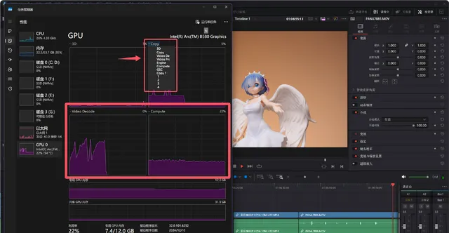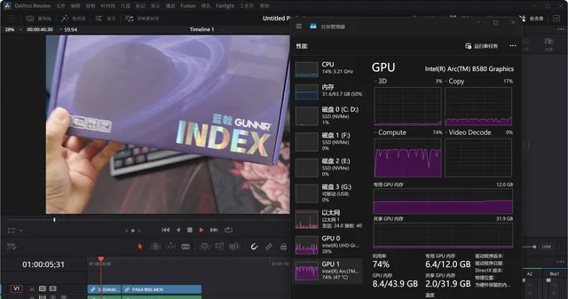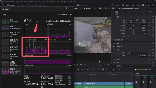 不過值得一提的是,B580是有雙解碼器的,所以在工作管理員中理論上是應該能看到Video Decode和Video Decode1兩個解碼器,但是目前Video Decode1沒有正確顯示在工作管理員中(小bug等待Windows、驅動更新就能解決),不過這並不影響第二個解碼器的使用,這張圖前一段解碼的是XAVC,可以看到達芬奇呼叫了Video Decode。後面一段是在解碼HEVC,從占用率來看,達芬奇此時是呼叫了第二個解碼器Video Decode1在進行解碼工作。
