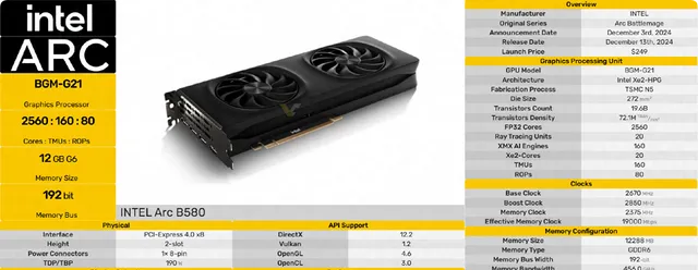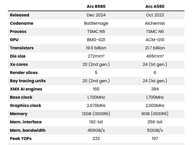 先發一共有兩款:B580 和定位稍低的 B570,已經上市的「Arc B580」有 20 個 Xe 內核,最大頻率 2,670 MHz,視訊記憶體匯流排寬度 192 bit,視訊記憶體速度 19 Gbps,視訊記憶體頻寬 456 GB/s,視訊記憶體容量依舊量大管飽,非常有誠意的給到了 12GB GDDR 6A,這對於達芬奇之類生產力需求來說非常重要(已經開始期待 B770 的視訊記憶體容量啦) 。