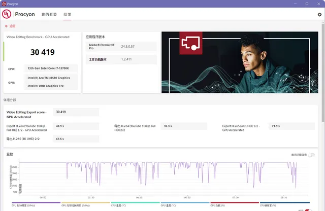 然後是Procyon 視訊基準測試Video Editing Benchmark,這是個基於Pr的測試。P.S.忘記關核顯了,不過問題不大。個人感覺B580的編解碼器沒有被正確呼叫,應該是依靠fixed-function hardware +shader-based在編解碼,不過問題不大,畢竟剛上市後,後續版本應該就會更新相容。