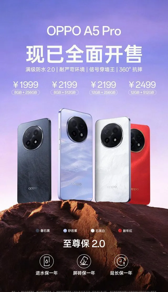 價格戰線:從1999元起,這個價位絕對是價效比王者。四種顏色隨你挑:「砂巖紫」大氣,「石英白」清新,「磐石黑」穩重,「新年紅」更是滿滿的節日氣息。不同容量任你選,從8+256GB到12+512GB,滿足你所有效能幻想。