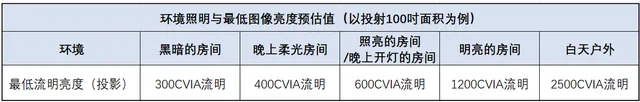 選擇多少亮度的投影機,一個基本原則就是,根據自己的使用場景去選擇合適的亮度。比如白天還是晚上,開燈還是關燈,臥室還是客廳,不同的環境需要的亮度都有差異。我們對照不同環境看電視需要的亮度,可以基本得出看投影機對應需要多少亮度,可以參考下表數據: