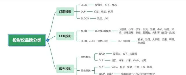 現在投影機品牌也是五花八門,不同的品牌有各自的市場定位和技術路線。為方便大家分認清品牌,我基於光源和顯示技術的分類,梳理了一個投影品牌清單。