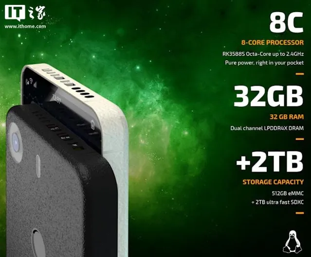 產品搭載 Rockchip RK3588S 處理器 (4 個 Cortex A76 加 4 個 Cortex A55 核心,最高 2.4Ghz 頻率),輔以 32GB LPDDR4x 記憶體 ,其 512GB eMMC 儲存可拆卸 ,也支持 MicroSD 卡擴充套件最多 2TB 容量。手機支持 5G、Wi-Fi 5 和藍芽 5.0,並設有 雙 USB-C 介面 。