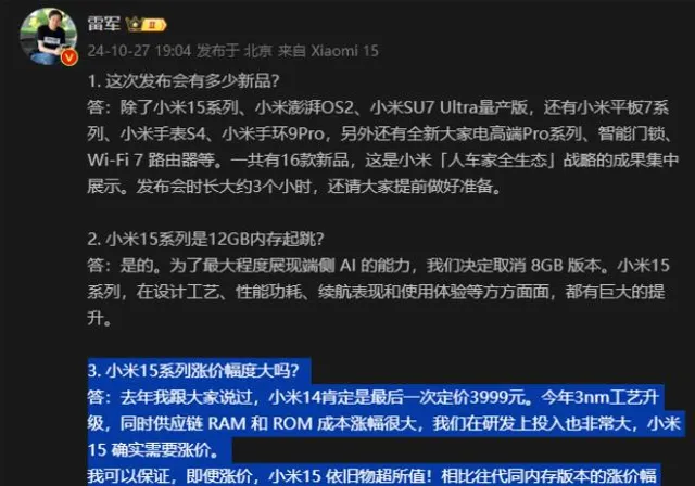至於大家關心的售價問題,雷軍和盧偉冰其實也在此前給大家打了「預防針」。雷軍表示小米14是最後一次定價3999。考慮到今年元器件成本上漲(SoC、RAM和ROM)和研發投入,小米15確實需要漲價。