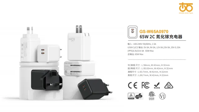 古石65W 2C氮化鎵充電器型號為GS-W65A0970,輸入規格為100-240V~50/60Hz 1.5A。配備2個USB-C介面,最高支持65W總輸出。中規、美規產品尺寸為58*42*32mm,歐規、韓規產品尺寸為95.85*42*32mm,澳規產品尺寸為83.7*42*32mm,英規產品尺寸為86.7*42*32mm,透過CE、FCC、RoHS、RCM、ETL等認證。
