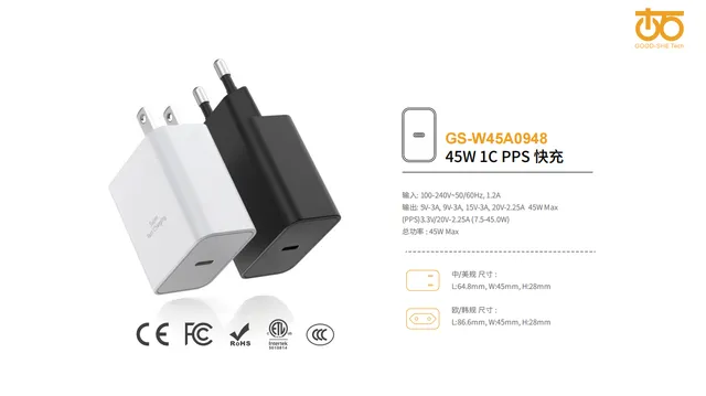 古石45W 1C PPS快充型號為GS-W45A0948,輸入規格為100-240V~50/60Hz 1.2A。配備1個USB-C介面,最高支持45W總輸出。中規、美規產品尺寸為64.8*45*28mm,歐規、韓規產品尺寸為86.6*45*28mm,透過CE、FCC、RoHS、ETL、CCC等認證。