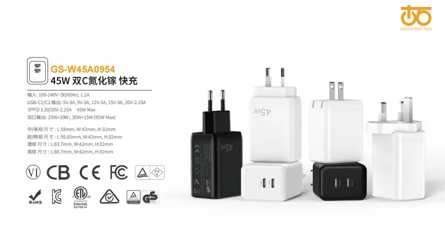 古石45W 雙C氮化鎵快充型號為GS-W45A0954,輸入規格為100-240V~50/60Hz 1.2A。配備2個USB-C介面,最高支持45W總輸出。中規、美規產品尺寸為58*42*32mm,歐規、韓規產品尺寸為95.85*42*32mm,澳規產品尺寸為83.7*42*32mm,英規產品尺寸為86.7*42*32mm,透過CB、CE、FCC、KC、RoHS、ETL等認證。