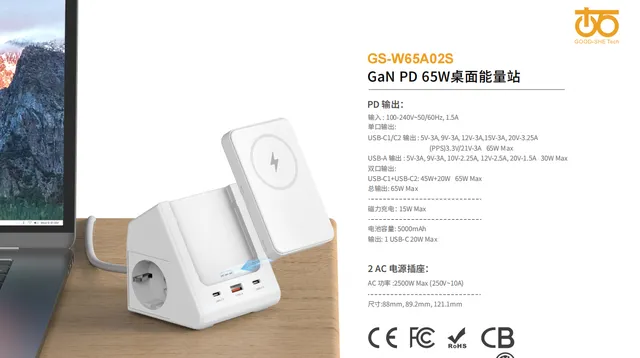 古石GaN PD 65W桌面能量站型號為GS-W65A02S,輸入規格為100-240V~50/60Hz 1.5A。配備2個USB-C介面和1個USB-A介面,最高支持65W總輸出;還支持15W磁吸充電,內建一個5000mAh充電寶,支持20W輸出。產品擁有兩個功率為2500W的AC電源插座,尺寸為88*89.2*121.1mm,透過CE、FCC、RoHS、CB、PSE、KC、ETL等認證。