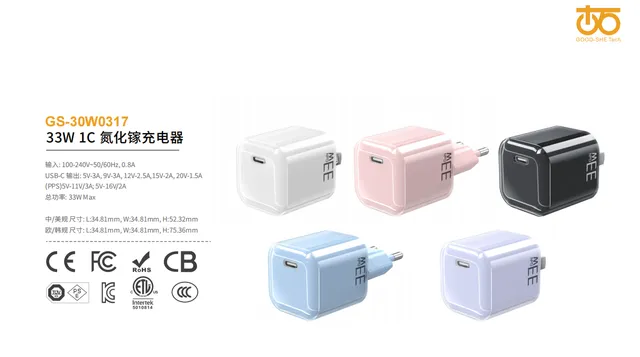 古石33W 1C氮化鎵充電器型號為GS-30W0317,輸入規格為100-240V~50/60Hz 0.8A。充電器擁有白色、黑色、粉色、藍色、紫色可選,配備1個USB-C介面,最高支持33W總輸出。中規、美規產品尺寸為34.81*34.81*52.32mm,歐規、韓規產品尺寸為34.81*34.81*75.36mm,透過CE、FCC、RoHS、CB、PSE、ETL、CCC等認證。