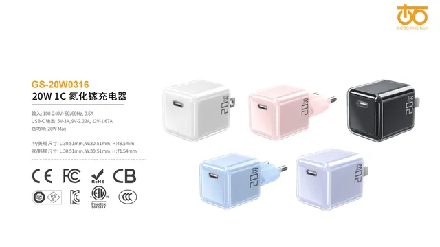 古石20W 1C氮化鎵充電器型號為GS-20W0316,輸入規格為100-240V~50/60Hz 0.6A。充電器擁有白色、黑色、粉色、藍色、紫色可選,配備1個USB-C介面,最高支持20W總輸出。中規、美規產品尺寸為30.51*30.51*48.5mm,歐規、韓規產品尺寸為30.51*30.51*71.54mm,透過CE、FCC、RoHS、CB、PSE、ETL、CCC等認證。