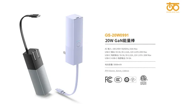 古石20W GaN能量棒型號為GS-20W0991,輸入規格為100-240V~50/60Hz 0.6A。充電寶容量為5000mAh,擁有黑灰色、紫色兩種選擇,配備1個USB-C介面和一條USB-C線,最高支持20W總輸出。產品尺寸為31*31*118mm,透過CCC、FCC、PSE、ETL等認證。