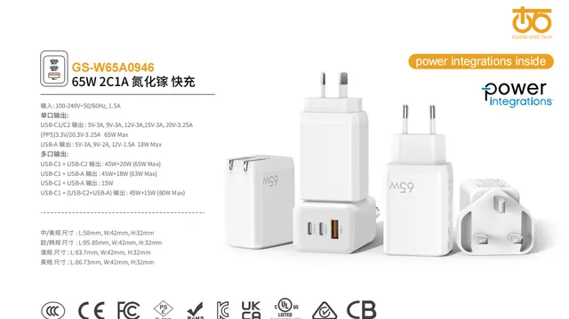 古石65W 2C1A氮化鎵快充型號為GS-W65A0946,輸入規格為100-240V~50/60Hz 1.5A。配備2個USB-C介面和1個USB-A介面,最高支持65W總輸出。中規、美規產品尺寸為58*42*32mm,歐規、韓規產品尺寸為95.85*42*32mm,澳規產品尺寸為83.7*42*32mm,英規產品尺寸為86.73*42*32mm,透過CCC、CE、FCC、PSE、RoHS、KC、UKCA、UL、RCM、ETL等認證。