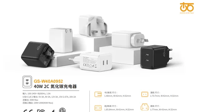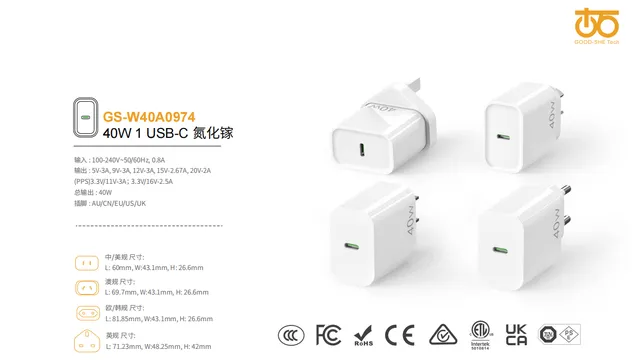 古石40W 1USB-C氮化鎵充電器型號為GS-W40A0974,輸入規格為100-240V~50/60Hz 0.8A。充電器配備1個USB-C介面,最高支持40W總輸出。中規、美規產品尺寸為60*43.1*26.6mm,澳規產品尺寸為69.7*43.1*26.6mm,歐規、韓規產品尺寸為81.85*43.1*26.6mm,英規產品尺寸為71.23*48.25*42mm,透過CCC、FCC、RoHS、CE、PSE、ETL、UKCA等認證。