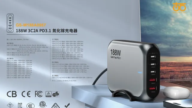 古石188W 3C2A PD3.1氮化鎵充電器型號為GS-W188A0957,輸入規格為100-240V~50/60Hz 2.5A。配備3個USB-C介面和2個USB-A介面,支持PD3.1 140W單口輸出,最高支持188W總輸出。產品尺寸為123*90*33.7mm,透過CB、CE、FCC、PSE、KC、CCC、ETL等認證。