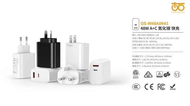 古石48W A+C氮化鎵快充型號為GS-W48A0943,輸入規格為100-240V~50/60Hz 1.2A。配備1個USB-C介面和1個USB-A介面,最高支持48W總輸出。中規、美規產品尺寸為73.1*51*29mm,歐規、韓規產品尺寸為94.85*51*29mm,澳規產品尺寸為82.7*51*29mm,英規產品尺寸為86.4*51*42mm,透過CCC、CE、FCC、RoHS、RCM、ETL等認證。