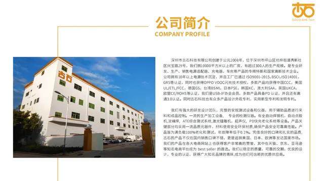 深圳市古石科技有限公司建立於公元2008年,位於深圳市坪山區坑梓街道秀新社群興寶路29號,我們擁10000平方米以上的廠房,有超過300人的生產規模。是專業研發、生產、銷售電源介面卡、充電器、車充等產品的專精特新和國家高新技術企業。公司擁有10年以上電源技術沈澱,並且工廠已透過IS09001-2015,BSCI,SO14001,GRS等認證,同時也獲得OPPO VOOC閃充技術授權,多款產品均獲得中國CCC,美國UL/ETL/FCC,德國GS,台灣BSMI,日本PSE,南韓KC,澳大利SAA,英國UKCA,歐盟CE/ROHS等認證,我們是USB-IF協會會員,多款產品具備PD認證,並且還有高通3.0認證。同時古石科技也有眾多產品設計外觀專利,實用新型專利和發明專利。