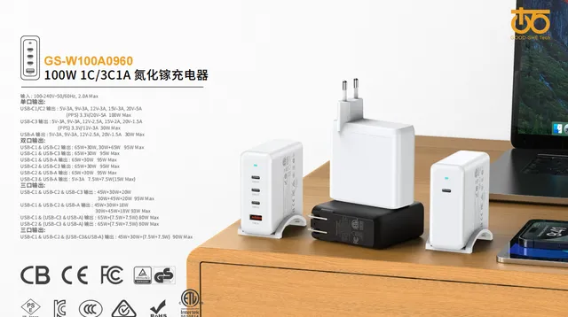 古石100W 1C/3C1A氮化鎵充電器型號為GS-W100A0960,輸入規格為100-240V~50/60Hz 2.0A。配備3個USB-C介面和1個USB-A介面,最高支持100W總輸出。產品透過CB、CE、FCC、PSE、KC、CCC、ETL等認證。