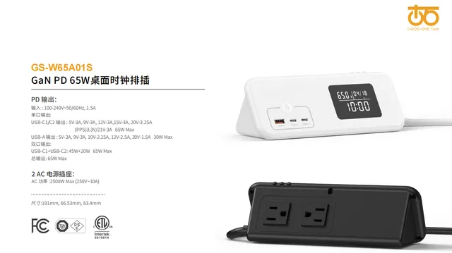 古石GaN PD 65W桌面時鐘排插型號為GS-W65A01S,輸入規格為100-240V~50/60Hz 1.5A,寬幅電壓全球通用。配備2個USB-C介面和1個USB-A介面,最高支持65W總輸出。還擁有兩個功率為2500W的AC電源插座,表面有一塊顯示器,可顯示功率和時間等資訊。產品尺寸為191*66.53*63.4mm,透過FCC、PSE、ETL等認證。
