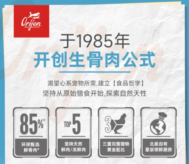 Orijen始終堅持生物適應力飲食理念,致力於提供與犬類自然飲食相符的狗糧。這一品牌強調使用新鮮、當地采購的高品質成分,確保狗狗能夠獲得足夠的蛋白質和營養。此外,Orijen的產品不添加任何人工色素或防腐劑,保證其狗糧的純凈和健康。透過科學配比,他們的狗糧不僅支持狗狗的活力,還對皮毛和消化系統有明顯改善,同時適合不同犬齡和體重的需求。