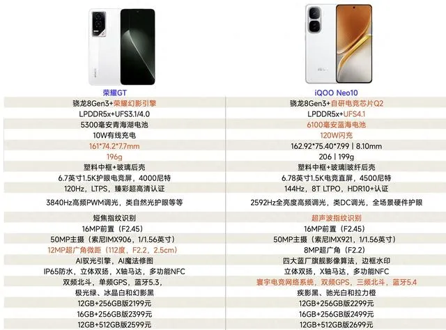 差價100元,iQOO Neo10和榮耀GT怎麽選?對比一下就懂了。透過橫向對比,我們可以更直觀的看到某款機型的優缺點,然後結合自己的需求進行選購。榮耀GT的優勢可以總結為更低價格,更薄機身,更強廣角和榮耀幻影引擎,iQOO Neo10的優勢是自研電競芯片,更強的續航組合,超音波指紋辨識和更優秀的定位系統。