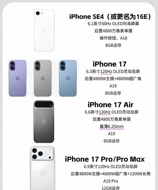 只有一顆4800萬的主攝,還是60hz高刷,還是128g起售,不過處理器可能會給上A18,這個實話還是挺良心的。而且還可能用上蘋果自研的5G基頻。