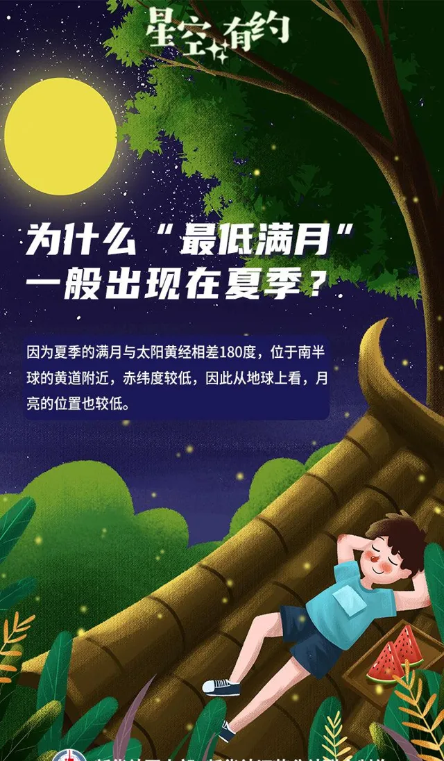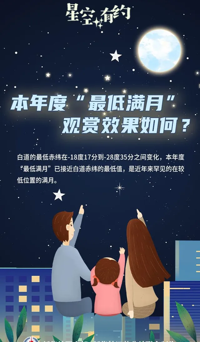 「而6月12日7時42分,月球位於天球最南方,其地心視赤緯為-28度24分。由於這一時間點與滿月時刻很接近,所以6月11日的滿月為年度‘最低滿月’。」王科超說。